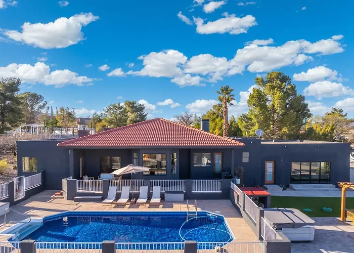 Located 3.1 miles from Old Town Center for the Arts Concert Hall, the 4-bedroom Luxury 5Br Cottonwood Retreat With Pool And Panoramic Views Villa boasts a private pool with a hot tub. Featuring a patio, this 4-bathroom holiday home is situated approximately 25 minutes' walk from Walmart Supercenter.